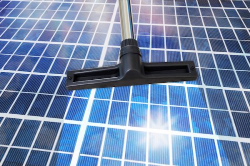 Window Cleaning is often being asked to clean Solar Panels. Our expertise includes everything from huge expanses of Solar Panels on the roofs of large commercial buildings with flat or pitched roofs to panels on a steep grade on the ground. Solar Panels will lose 50%, yes, 50% efficacy when dirty. Our recommended cleaning frequency for Solar Panels is quarterly to properly maximize the efficiency of your Solar Panels. Due to the fragility of most panels, we utilize de-ionized water-fed pole systems with special soft bristle brushes in order to prevent any damage. We also avoid using any detergents or abrasive powders as they may streak or scratch the glass of the panels and cause shadows. If the sun is beating down on the panels, water can quickly evaporate and likely just smear dirt around, so it helps to clean your solar panels on an overcast day, early in the morning or in the evening. Give Apex Window Cleaning a call to discuss and schedule your Solar Panel Cleaning!